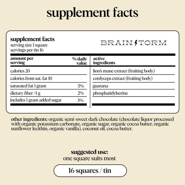 Enjoy one square of Brainstorm daily in the morning or afternoon for an instant boost of natural energy and focus. Know that you are working to regrow your brain with everyday use. Bring things back into focus with Alice. Indulge in daily functional mushroom chocolate brain supplements, which contain potent nootropics that you can feel.