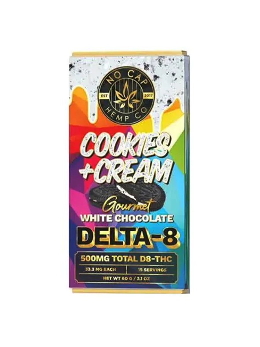 Cookies x Cream No Cap Hemp Co Delta 8 White Chocolate Bar 500mg can help reduce daily stress and anxiety, promote physical relaxation, mental clarity, and focus, reduce inflammation, facilitate movement, and promote overall well-being. Made from 100% legal USA hemp and compliant with the 2018 Farm Bill, this chocolate bar contains less than 0.3% Delta-9 THC, ensuring a safe and non-psychoactive experience. Enhance your mood and uplift your spirits with this delicious chocolate bar that provides an uplifting and euphoric buzz. Please note that these products are not meant to treat, diagnose, prevent, or cure any illnesses.