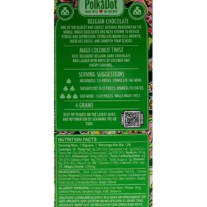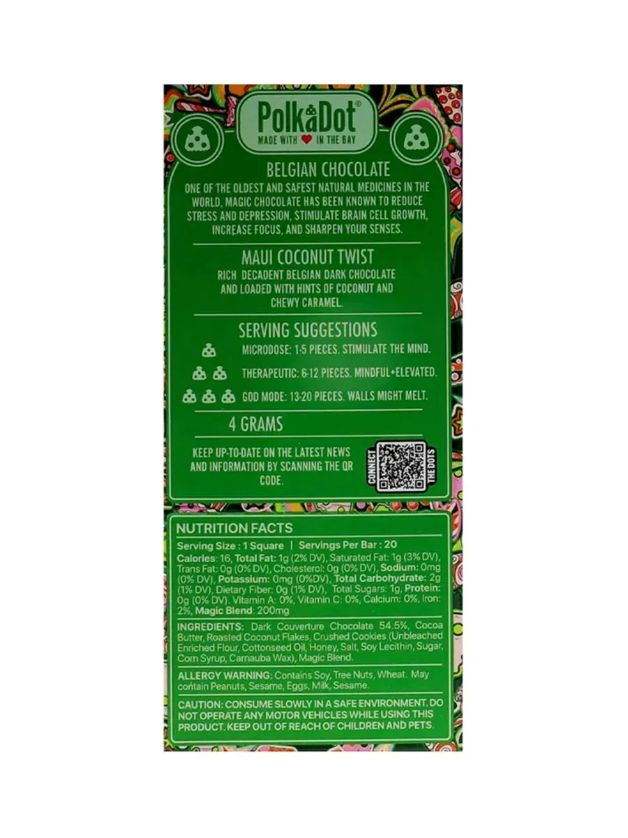 Experience a sensory getaway to Maui with Maui Coconut Twist PolkaDot Mushroom Belgian Dark Chocolate 200mg Per Piece. Indulge in the tropical essence of creamy coconut delicately blended with the bold richness of Belgian dark chocolate. Each decadent bite transports you to sunlit beaches and lush palm groves, creating a harmonious symphony of flavors. Infused with 200mg of mushrooms, it’s paradise in every mouthful.