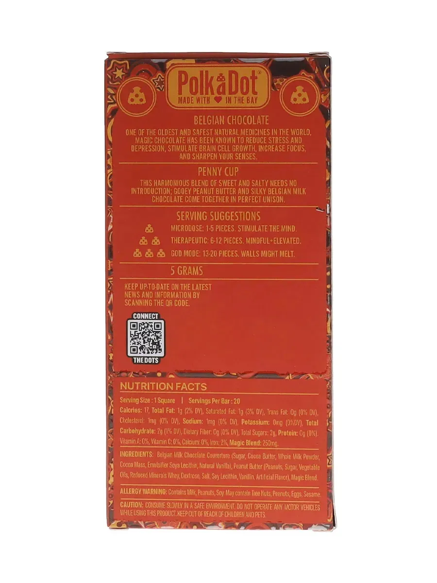 A chocolate and peanut butter lover’s dream, Penny Cup PolkaDot Mushroom Belgian Milk Chocolate 250mg delivers the perfect sweet and salty balance. The smooth, creamy peanut butter is wrapped in rich Belgian milk chocolate, creating a classic yet otherworldly combination. Infused with premium mushrooms, this bar is crafted for those who crave comforting flavors with an uplifting boost. Whether you’re looking for a nostalgic treat or a euphoric escape, Penny Cup is pure chocolate-peanut butter perfection.
