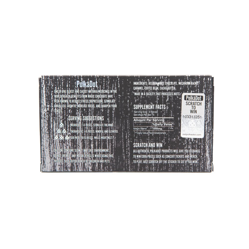 Polkadot x Sicko Vanilla Frappuccino Chocolate Bar invites you on a sensory journey to your favorite café, reimagined through the lens of gourmet confectionery. This exquisite treat marries the silky smoothness of Belgian white chocolate with the deep richness of caramel and the invigorating aroma of coffee beans, all enriched with the luscious texture of cacao butter. Each element contributes to a harmonious fusion of flavors that’s both comforting and indulgent. With an infusion of 5 grams of magic mushrooms, this bar transcends the ordinary, offering not only a luxurious taste experience but also an opportunity for profound exploration and insight.