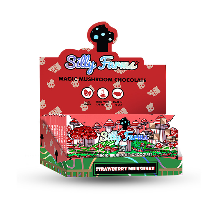 Silly Farms proudly presents STRAWBERRY MILKSHAKE, a luxurious chocolate homage to the quintessential strawberry milkshake. This exquisite confection melds the sweet, vibrant essence of fresh strawberries with the smooth, rich allure of milk chocolate, all enhanced by the mystical addition of Amanita Muscaria Muscimol extract.