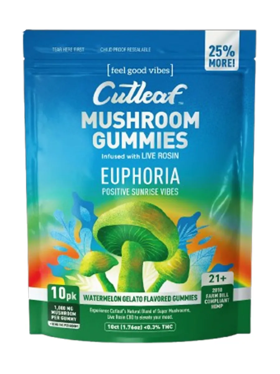 The Watermelon Gelato Cutleaf Euphoria Mushroom Gummies 1000mg 10ct combine the refreshing sweetness of watermelon with the creamy richness of gelato for a flavorful and uplifting experience. Infused with live rosin and a premium blend of super mushrooms, these gummies are crafted to enhance relaxation and positivity.